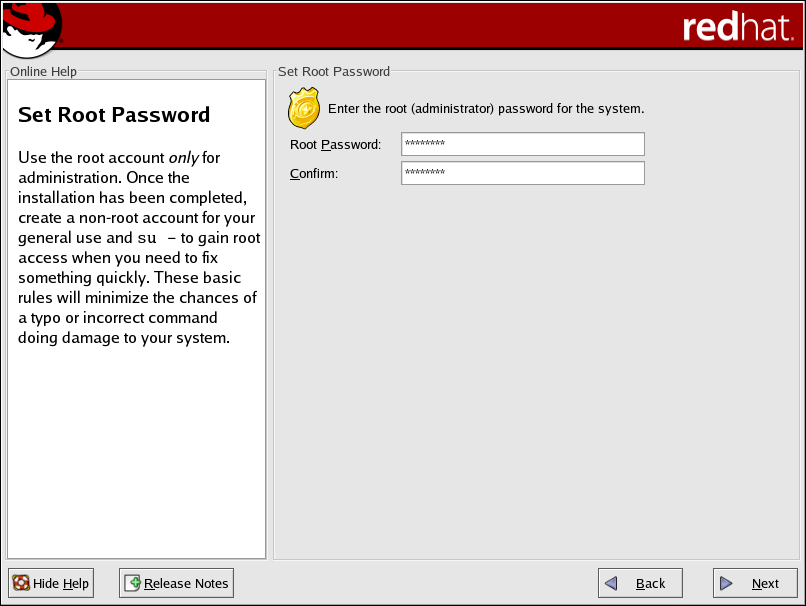 The root password must be at least six characters long; the password you type is not echoed to the screen. You must enter the password twice; if the two passwords do not match, the installation program asks you to enter them again.