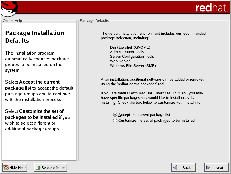First, a screen appears that details the default package set for your Red Hat Enterprise Linux installation. This screen varies depending on the version of Red Hat Enterprise Linux you are installing.