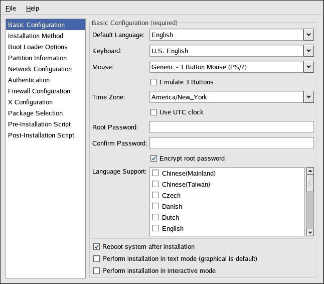 To install languages in addition to the one selected from the Default Language pulldown menu. check them in the Language Support list. The language selected from the Default Language pulldown menu is used by default after installation; however, the default can be changed with the Language Configuration Tool (redhat-config-language) after installation.
