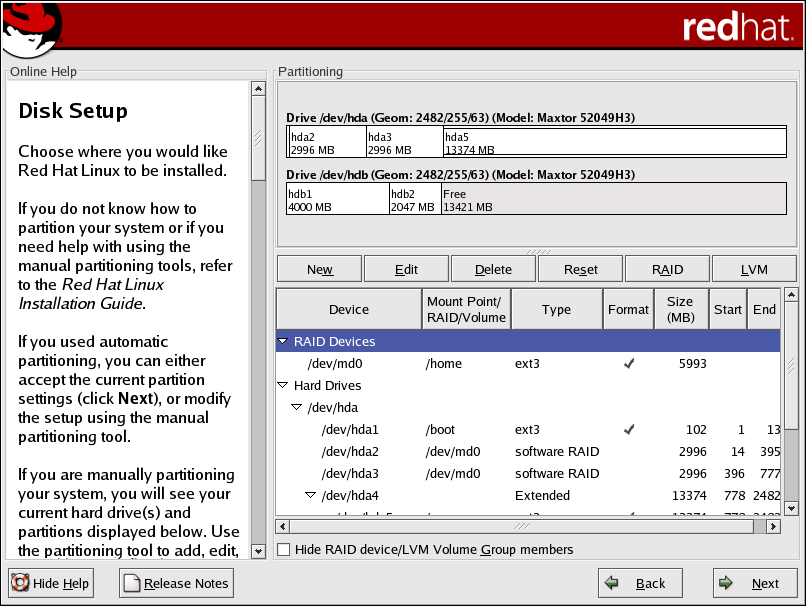 If you are making a RAID partition of /boot, you must choose RAID level 1, and it must use one of the first two drives (IDE first, SCSI second). If you are not creating a RAID partition of /boot, and you are making a RAID partition of /, it must be RAID level 1 and it must use one of the first two drives (IDE first, SCSI second).