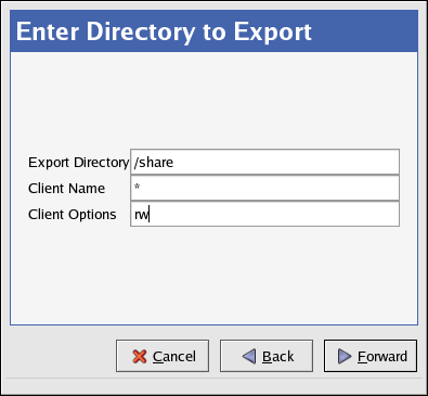 Enter the Export Directory — Specified as a child of a device, the export directory can be the same as the mount point. In this case, the entire file system is accessible through NFS. Alternatively, you can specify a portion (subdirectory) of a mounted file system to be mounted (instead of the entire file system). By exporting subdirectories of a mountpoint, different access rights can be allocated to different sets of NFS clients.