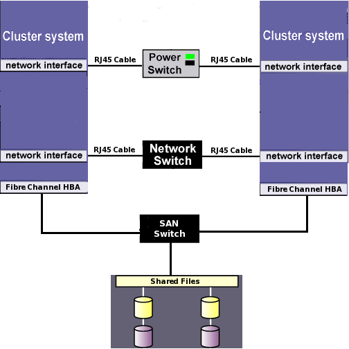 Figure 2-1 illustrates a hardware configuration with improved availability. This configuration uses a fence device (in this case, a network-attached power switch) and the nodes are configured for Red Hat GFS storage attached to a Fibre Channel SAN switch. For more information about configuring and using Red Hat GFS, refer to the Red Hat GFS Administrator's Guide.