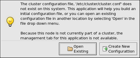 1. If this is the first time you have started the Cluster Configuration Tool, the program prompts you to either open an existing configuration or create a new one. Click Create New Configuration to start a new configuration file (refer to Figure 3-3).